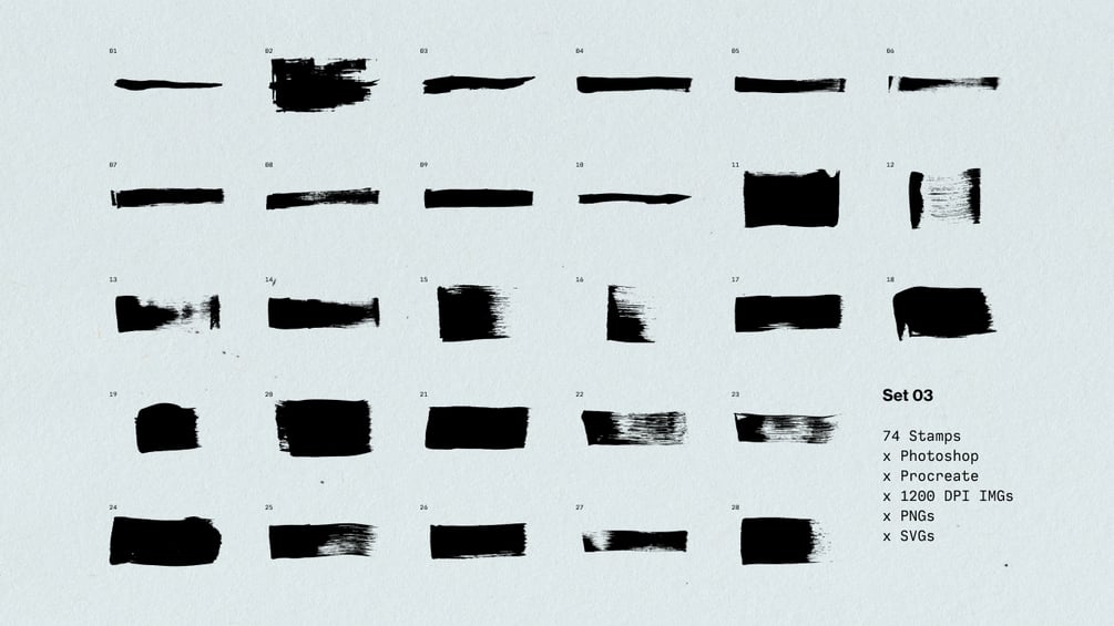 • 42 Chaotic Brushes - Photoshop and Procreate • 74 Stamps - Photoshop and Procreate • 100+ 1200dpi acrylic paint scans • 100+ SVGs • 100+ PNGSs • 3 Sets of Adobe Illustrator master files • 1 Paper scan